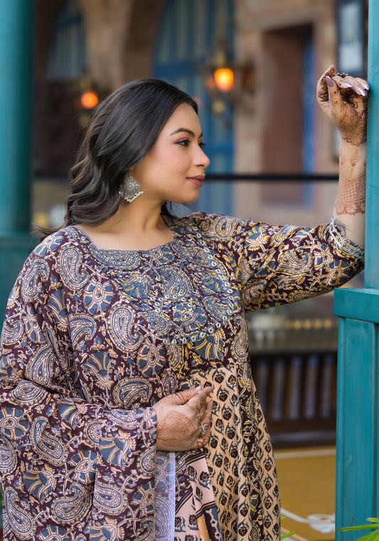 Beige Embroidered Anarkali Kurta & Dupatta Set (Pure Cotton)