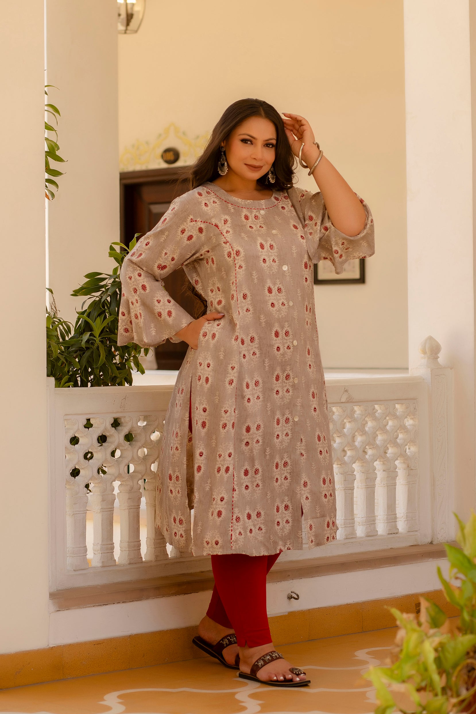 Beige Front Slit Princess Cut 'A' Line Kurta