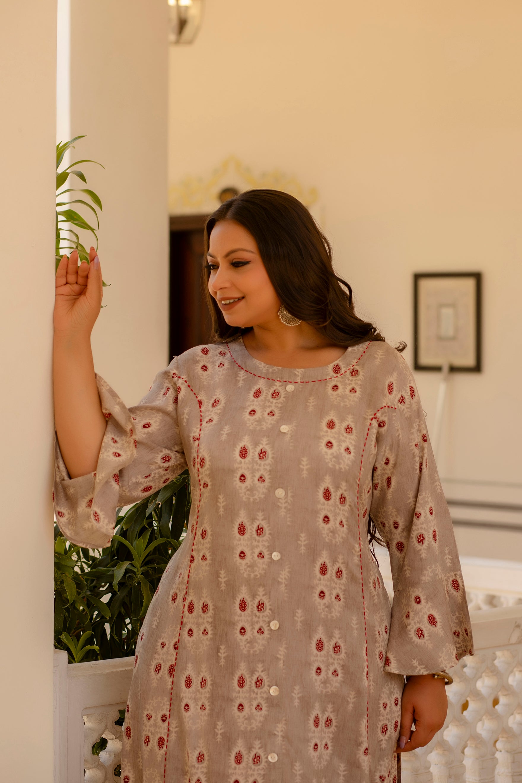- Beige Block Print Princess Cut Front Slit 'A' Line Kurta