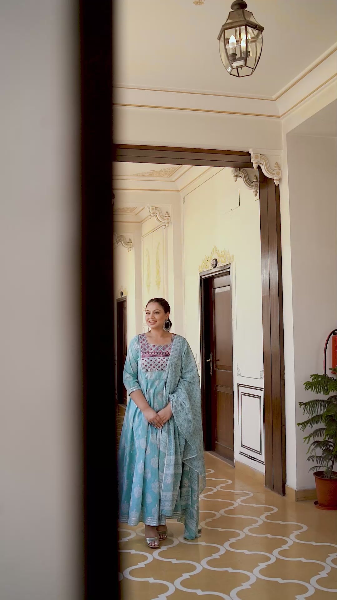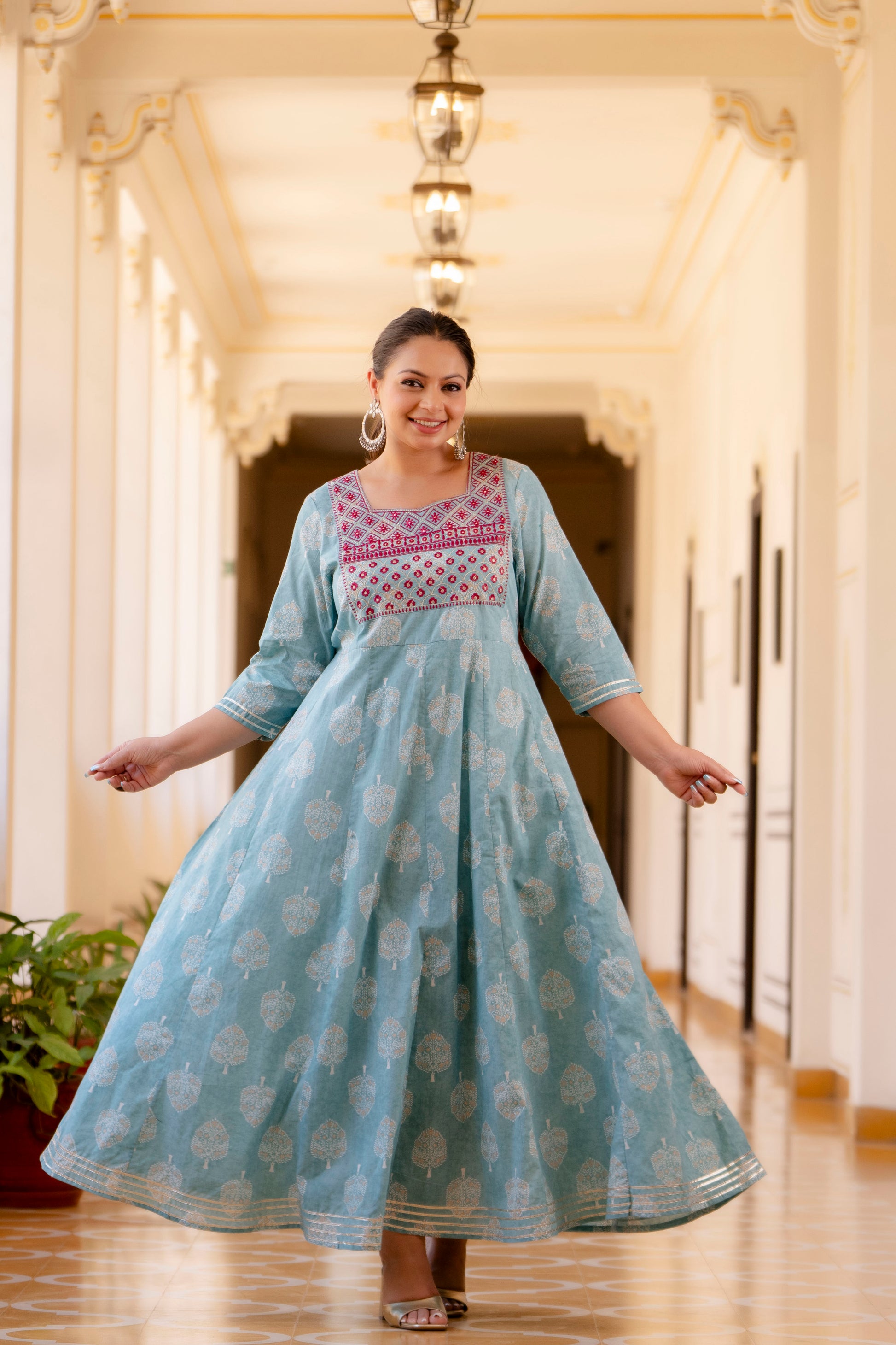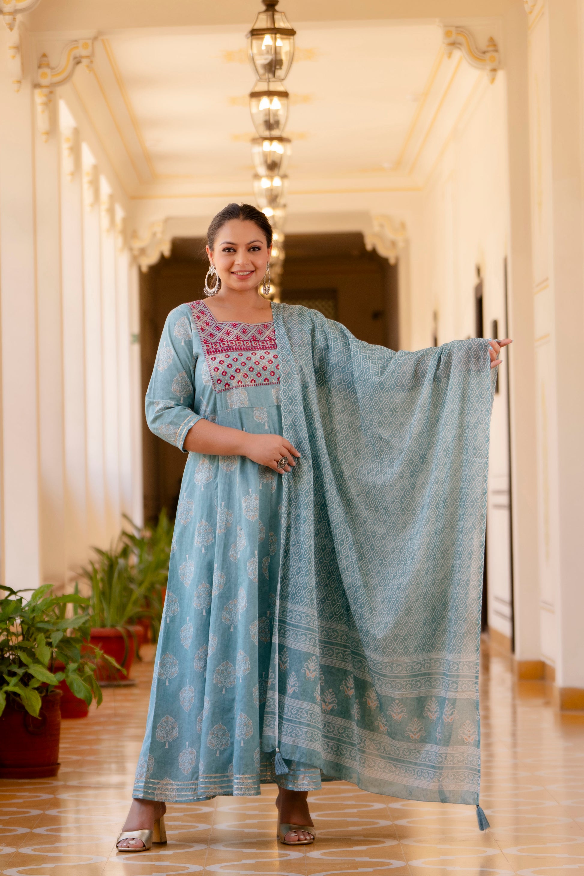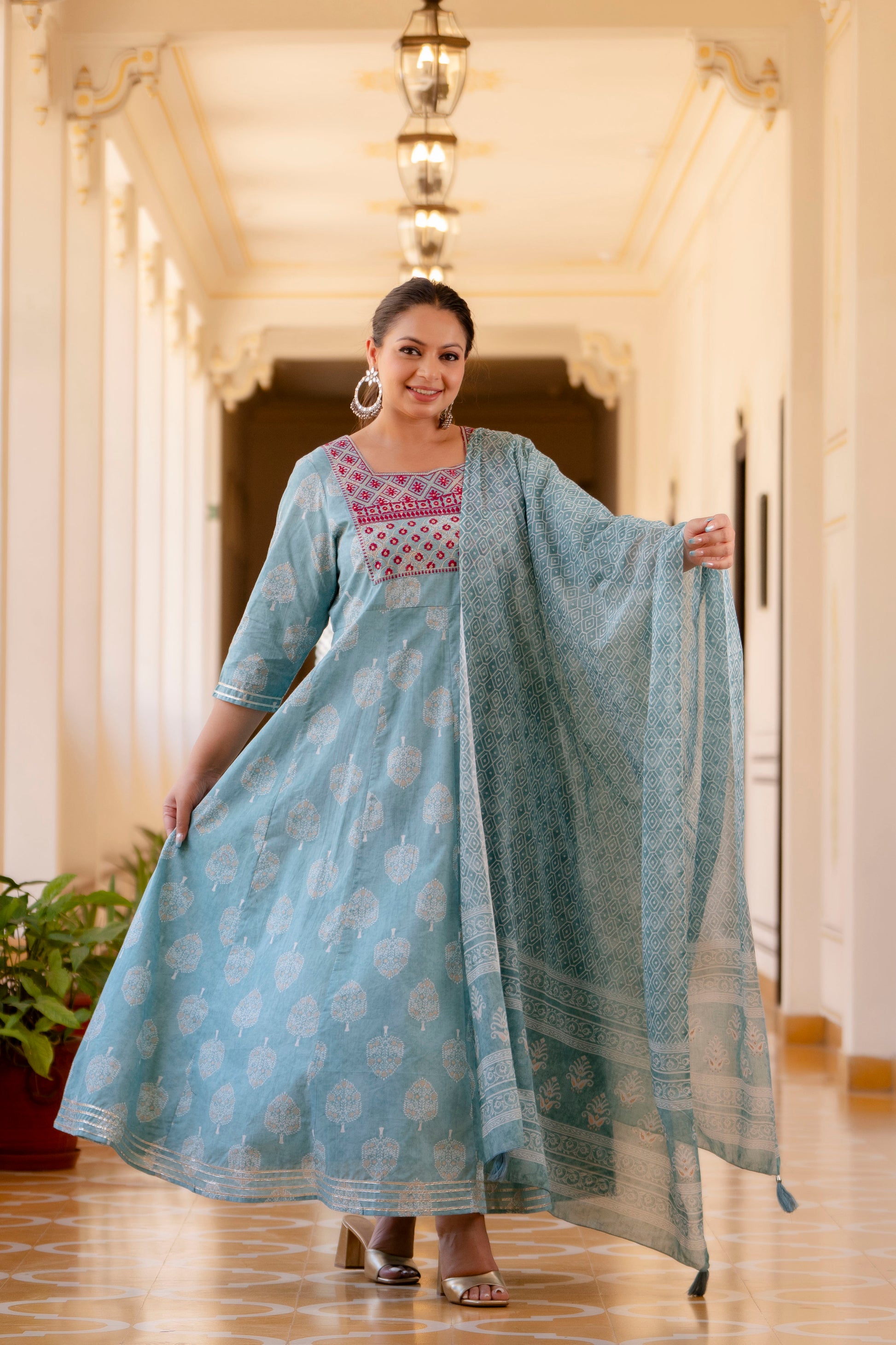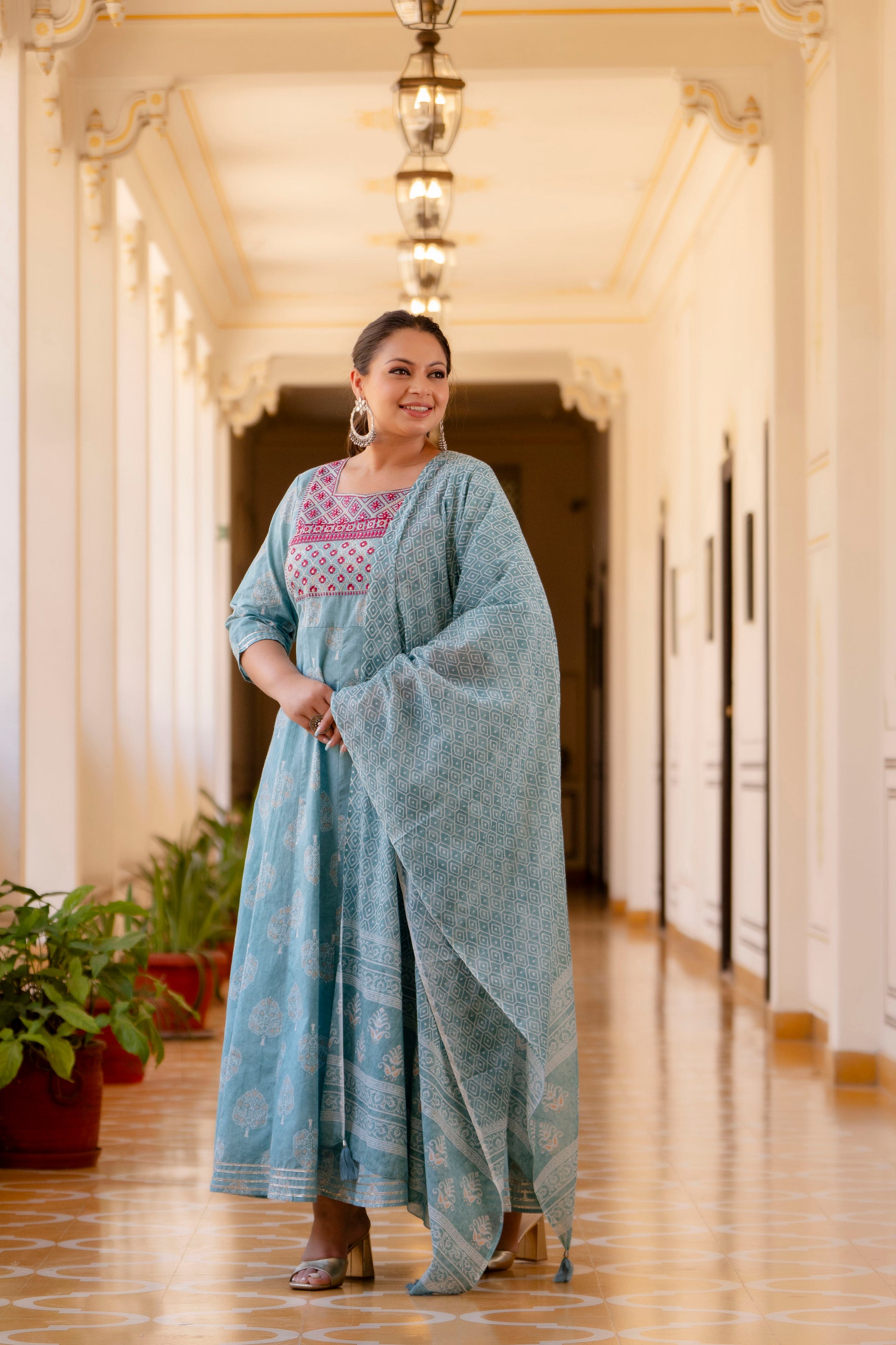 Light Blue Embroidered Anarkali Kurta & Dupatta Set (Pure Cotton)